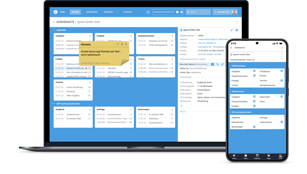Zeiten erfassen, Termine koordinieren, Adressen nachsehen, Angebote schreiben: Ihr Team hat alle Infos und Vorgänge genau dort, wo und wann es sie braucht. Am Desktop genauso wie unterwegs per App.